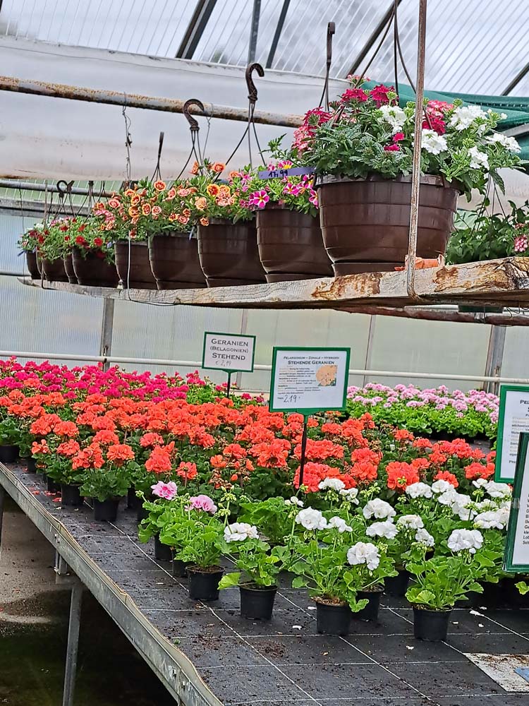 Wir verkaufen Pflanzen für Balkone und Beete, Kräuter, Gemüse, kleine Sträucher und Blumenstöcke. Bis Mitte Juni können Sie fast unser gesamtes Sortiment beziehen.
