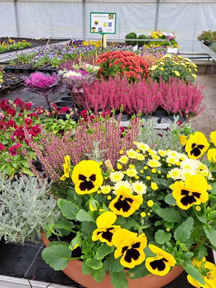 Entdecken Sie die Farbenpracht des Herbstes in unserer Gärtnerei! Wir bieten eine große Auswahl an herbstlichen Blumen, darunter Chrysanthemen, Astern und Heidekraut. Verschönern Sie Ihr Zuhause und Ihren Garten mit unseren frischen, hochwertigen Pflanzen. Auch für die Bepflanzung von Gräbern haben wir die typischen idealen Pflanzen im Herbst und auch im Frühling für Sie lagernd.